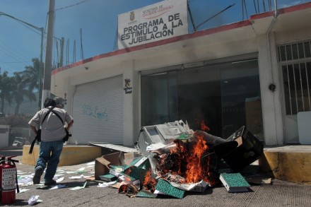 MÉXICO, D.F. (proceso.com.mx).- Un grupo de manifestantes cercó las instalaciones del Congreso de Guerrero donde deberá darse trámite a la licencia solicitada ayer por el gobernador Ángel Aguirre Rivero, mientras que otro contingente prendió fuego a las cercanas instalaciones del Programa de Estímulo a la Jubilación de la Secretaría de Educación estatal.
