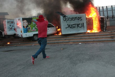 MÉXICO, D.F. (proceso.com.mx).- Estudiantes de Ayotzinapa y de otras normales incendiaron varios vehículos en el estacionamiento del Palacio de Gobierno en Chilpancingo, Guerrero y lanzaron piedras y bombas molotov contra el edificio.