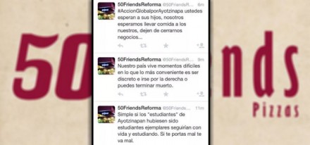 MÉXICO, D.F. (proceso.com.mx).- Al igual que la marca de chocolates Crunch México, la cadena de pizzerías 59 Friends publicó desatinados comentarios en su cuenta de Twitter relacionados con la desaparición de los 43 normalistas de Ayotzinapa.