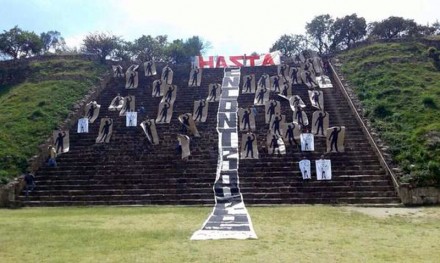 Mientras que en el centro ceremonial zapoteco de Monte Albán, declarado por la UNESCO como patrimonio cultural de la humanidad, activistas desplegaron en la pirámide sur una manta monumental –de unos 50 metros– con la leyenda: “Hasta encontrarlos”.