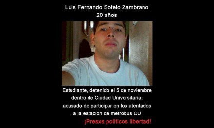 MÉXICO, D.F. (apro).- Luis Fernando Sotero, un preparatoriano de 20 años, fue declarado formalmente preso por participar en la quema de una unidad del Metrobús y de la estación Ciudad Universitaria de la Línea 1, el pasado 5 de noviembre.