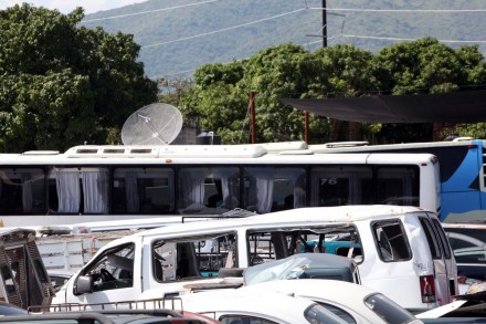 Los autobuses presentan impactos de bala en el parabrisas y tienen las ventanas destrozadas, mientras que las camionetas de la corporación policiaca se encuentran estacionadas en batería y acordonadas con cinta amarilla.