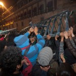 MÉXICO, D.F. (apro).- Una hora después de terminarse el mitin que coronó la marcha pacífica en solidaridad con los normalistas de Ayotzinapa desaparecidos, cientos de granaderos traspasaron las vallas que protegen al Palacio Nacional y desalojaron a cientos de manifestantes que permanecían en el Zócalo capitalino, lesionando a decenas.