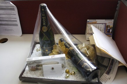 Subordinados del dirigente magisterial repartieron las botellas oficina por oficina. El precio actual de la botella de champagne es de alrededor de 3 mil pesos y el del ron de 800.