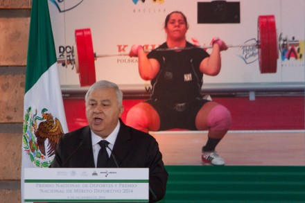 MÉXICO, D.F. (proceso.com.mx).- Sin importar que la pesista Gladis Bueno esté cumpliendo una sanción por haber dado positivo en un control antidopaje, para la entrega del Premio Nacional de Deportes 2014 los organizadores colocaron como fondo una fotografía de la atleta justo detrás del atril donde el secretario de Educación Pública, Emilio Chuayffet, dirigió un mensaje a los ganadores.