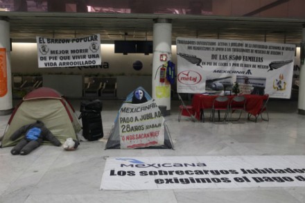 A la altura de la puerta 3 se ubicaba el espacio de Mexicana de Aviación. Antes repleto de pasajeros, ahora está lleno de pancartas que exigen justicia para los jubilados. Otras del SME, del sindicato de Bancomext y El Barzón solidarizándose con la causa. Una más de la Asociación de Jubilados y Trabajadores de Mexicana que dice: “Osorio Chong ordenó el pago de nuestras pensiones, exigimos su cumplimiento”. Cuatro mamparas con fotos de lo que fue Mexicana y dos personas resguardando el plantón.