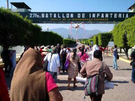 Durante más de dos horas, los padres de familia y estudiantes solidarios bloquearon la entrada principal del cuartel, mientras que un grupo de soldados desarmados formaron una valla humana para impedirles el acceso. Ninguno se movió mientras los deudos reprochaban la criminal indolencia que asumió el Ejército frente a la campaña de exterminio de los estudiantes normalistas.