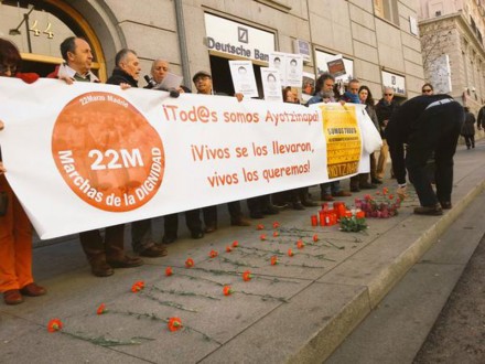 El estudiante universitario Izcoatl García, integrante de #Yosoy132-Madrid, advirtió en aquella ocasión que el propósito era “visibilizar en España lo que está pasando en México, la desaparición de los 43 estudiantes de la normal rural, pero no solamente eso, sino los homicidios, los asesinatos de periodistas, de defensores de derechos humanos, de activistas en defensa de la tierra”.