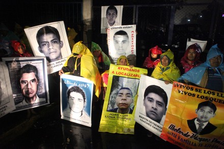 Bajo la lluvia, los familiares protestaron al lado de la Calzada Chivatito con las fotografías de los estudiantes desaparecidos en Ayotzinapa, Guerrero.