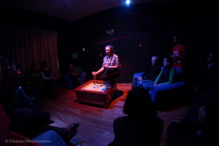 De esta manera se desarrolla el diálogo y la improvisación entre actores y público, mientras Alberto va enlazando en el espacio –con el apoyo didáctico de un hilo rojo– cada punto en la línea de tiempo que no es horizontal ni plana, mucho menos uniforme.