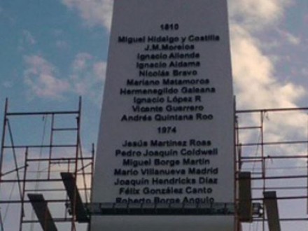 En el obelisco también aparecen los nombres de Miguel Hidalgo, José María Morelos y Andrés Quintana Roo, entre otros héroes de la Independencia de México.