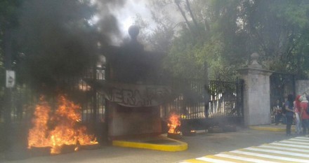 MORELIA, Mich. (apro).- Jóvenes normalistas incendiaron esta tarde la puerta principal de Casa de Gobierno, residencia oficial del mandatario Salvador Jara, y colocaron en el lugar una manta con la leyenda “¡Fuera Peña!”.