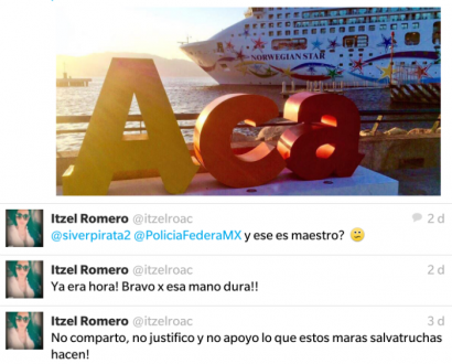 “Ya era hora! Bravo x esa mano dura!!”, expresó Itzel Romero, directora de Relaciones Públicas del complejo hotelero y de espectáculos en su cuenta personal de Twitter donde incluso dijo que ella estaría dispuesta a “atacar” a los manifestantes argumentando que no son justas ese tipo de protestas sociales.