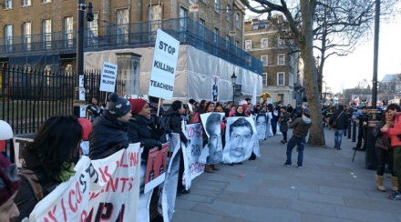La protesta, organizada por varios grupos, incluyendo a los colectivos YoSoy132Londres London Mexico Solidarity y Justice Mexico Now, forma parte de una serie de eventos y actividades bajo la consigna “EPNnotWelcome” (Enrique Peña Nieto no es bienvenido).