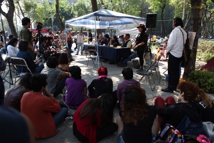 MÉXICO, D.F. (apro).- En pleno camellón del Paseo de la Reforma, frente a las oficinas del Consejo Nacional para la Cultura y las Artes (Conaculta), artistas y trabajadores instalaron mesas de trabajo para hablar, “a la vista” de la ciudadanía, de temas como los pagos de sueldos y prestaciones retrasados, disminución del presupuesto, y en general las políticas culturales con las que no están de acuerdo.
