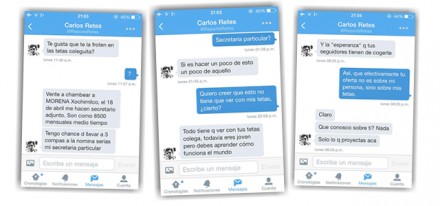 Al principio de la cibercharla le hizo una propuesta indecorosa; luego la invitó a trabajar en Morena Xochimilco como su secretaria particular. Según Retes, el próximo 18 de abril lo nombrarían secretario adjunto y le pagarían 8 mil 500 pesos por laborar medio tiempo.