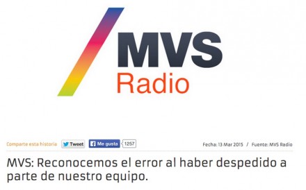 El mensaje permaneció durante unos minutos antes de ser eliminado. Indicaba que “algunos medios y personas han calificado de ‘inédita y desproporcionada’ la decisión de despedir a dos de nuestros colaboradores: Daniel Lizárraga e Irving Huerta. Después de celebrada una junta extraordinaria con Directivos de MVS, hemos decidido señalar nuestra verdad”.