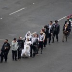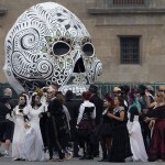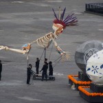 MÉXICO, D.F. (apro).- “Here it goes”, anuncia una voz masculina en el micrófono que se escucha en toda la plancha del Zócalo. El sonido de las hélices del helicóptero se aproxima. A unos 20 metros de altura, en la avenida 20 de Noviembre aparece la aeronave que sobrevuela esqueletos gigantes y cientos de catrinas que simulan el Día de Muertos… en pleno marzo.
