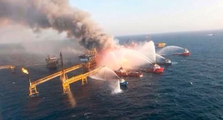 Tras el percance, personal a bordo del complejo petrolero, compuesto por cinco plataformas, se lanzó al mar para escapar de las llamas.