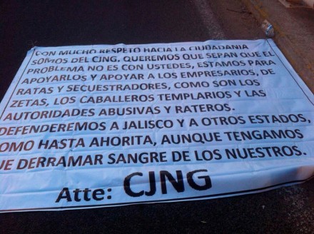 “Con mucho respeto a la ciudadanía somos del CJNG. Queremos que sepan que el problema no es con ustedes, estamos para apoyarlos y apoyar a los empresarios, de ratas y secuestradores, como son los Zetas, los Caballeros Templarios y las autoridades abusivas y rateros. Defenderemos a Jalisco y a otros estados, como hasta ahorita, aunque tengamos que derramar sangre de los nuestros”, se lee en una de las mantas firmadas por el CJNG.