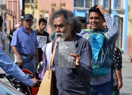 Alrededor de las 10:00 horas, el premio nacional de las artes inauguró la venta conmemorativa en el andador turístico al colocar un puesto frente al Instituto de Artes Gráficas de Oaxaca y recorrer durante dos horas negocios, restaurantes, librerías y espacios culturales del Centro Histórico.