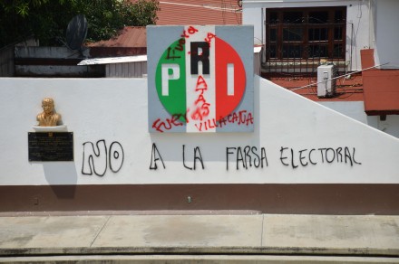 OAXACA, Oax. (apro).- “¡Fuera Fidel Herrera!”, “Asesinos”, “Corruptos”, “Partido traidor de México” y “Muerte al PRI”, fueron los mensajes que plasmaron los maestros de la Sección 22 del Sindicato Nacional de Trabajadores de la Educación (SNTE-CNTE) en la sede del PRI donde también realizaron actos vandálicos.