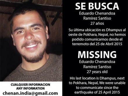 MÉXICO, D.F. (proceso.com.mx).- Familiares del mexicano Eduardo Chenandoa Ramírez Santiso, de 27 años, quien estaba en Dhamphus, Nepal, lo reportaron como desaparecido tras el sismo ocurrido este sábado en ese país.
