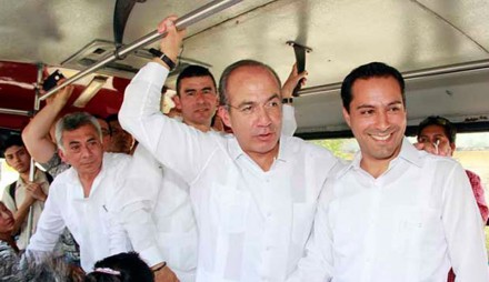 MÉRIDA, Yuc. (apro).- El expresidente Felipe Calderón Hinojosa llegó hoy a esta capital para respaldar a Mauricio Vila Dosal, candidato del PAN a la alcaldía, con quien sorprendió a la ciudadanía al abordar un autobús del transporte público para trasladarse al término de un evento.