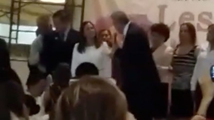 El líder, entonces, decide no darle la palabra y, al micrófono, comienza a agradecerle a Ivonne por encontrarse en ese momento ante ellos para felicitar a las madres del Seguro Social. Sus palabras son constantemente acompañadas por muestras de rechazo de las presentes.