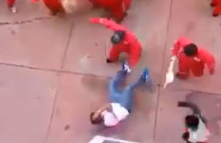 El segundo brigadista que lo golpeó en la cabeza, se acerca nuevamente y le propina otro golpe en la cabeza, que esta vez lo hace desplomarse en el suelo una vez que se rompió el asta.
