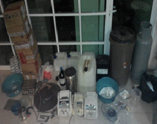 De igual manera se localizaron un frasco de glicerina de 50 mililitros, una botella de 2.5 litros de ácido clorhídrico, una lata de aerosol color blanco de antióxido, un tanque de gas de 20 kilogramos, 7 paquetes de papel blanco, una prensa, un garrafón con etilmetilcetona de 18 litros, una cacerola con 3 bolsas de plástico con polvo blanco en su interior, un refractario de vidrio con una bolsa de plástico con polvo blanco y una bolsa negra con polvo blanco.