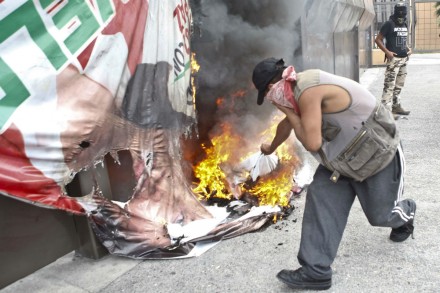 Normalistas de Ayotzinapa acompañados de padres de los 43 retiran propaganda política y la queman frente a Palacio de Gobierno en Chilpancingo.