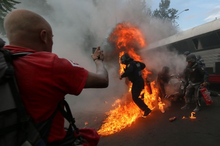 La lluvia de piedras se intensificó, e incluso estallaron unos artefactos encendidos, los cuales prendieron fuego a los uniformes de algunos policías.