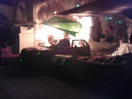 El grupo de choque incendió vehículos, casas de campaña y mobiliario.