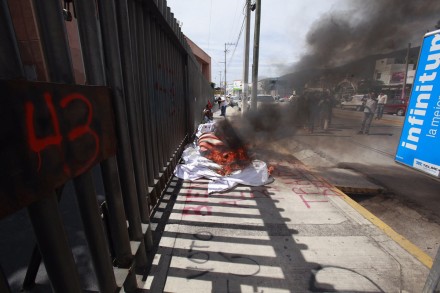Alrededor de las 11 horas un grupo de maestros rompió los candados de la reja principal del PRI y usando zapapicos, abrieron el auditorio de ese partido de donde sacaron una enorme manta de más de 10 metros cuadrados a la que prendieron fuego.