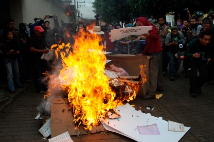 CHILPANCINGO, Gro. (proceso.com.mx).- Normalistas de Ayotzinapa encabezados por padres de los 43 estudiantes desaparecidos, han quemado más de 20 casillas en la cabecera municipal de Tixtla.