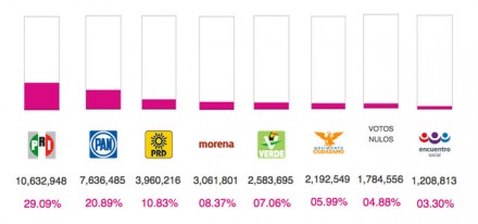 MÉXICO, D.F. (apro).- Con 95% de las actas computadas por el Programa de Resultados Preliminares (PREP), la votación revela que los tres principales partidos que formaron parte del Pacto por México, firmado el 2 de diciembre de 2012, perdieron sufragios en relación con los comicios de 2009 para renovar la Cámara de Diputados.