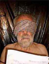 Está de pie y tiene frente a él un letrero con la fecha del domingo 16 de mayo. Desnudo su torso y casi blancos el bigote y la barba, piel apiñonada, frente amplia y algunas manchas en el rostro. Sus hombros están encogidos.