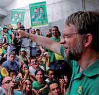 Para convencer a sus seguidores de que la educación es su prioridad, Mockus llega siempre a las concentraciones públicas con un enorme lápiz amarillo en sus manos.