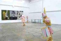 Y por último, lo más interesante de la exhibición: las esculturas de soldados realizadas con espuma de poliestireno por el holandés Folkert de Jong (1972). Provenientes de una instalación que, bajo el título de The Shooting at Watou, hace referencia a la batalla de independencia que libraron los Países Bajos contra España durante la guerra de los 80 Años (1568-1648), las esculturas de tamaño natural, con vestimentas militares y texturas empasteladas en color rosa, representan a los flamencos con una dramática ambivalencia que oscila entre la agresividad bélica y la desagradable –y divertida– empalagosidad del material. Incompleta en su contenido, la instalación de la galería carece de una figura esencial: la enorme, grotesca y amenazante alegoría de España.