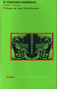 Al final de su vida, Mark Twain (Samuel Langhorne Clemens, 1835-1910) cayó en un profundo pesimismo que afectó a su obra postrera Las desgracias familiares, las malas inversiones, pero sobre todo sus reflexiones sobre el brutal capitalismo de Estados Unidos y la condición humana lo entristecieron y tornaron en un misántropo Aislado, escribió textos duros y críticos que pidió se editaran hasta después de su muerte Tal fue el caso de El forastero misterioso (Siruela Col Escolar de Filosofía; Madrid, 2008 191 p)